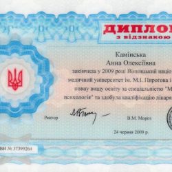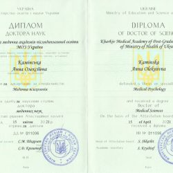 - 2010 рік – отримала сертифікат лікаря-спеціаліста за спеціальністю «медична психологія».