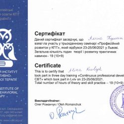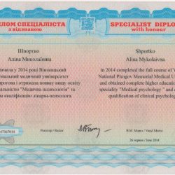 - 2015 рік – отримала сертифікат лікаря-спеціаліста за спеціальністю «медична психологія».