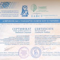 - 2018 р. – акредитація КПТ-терапевта у відповідності з стандартами Української асоціації КПТ та EACBT